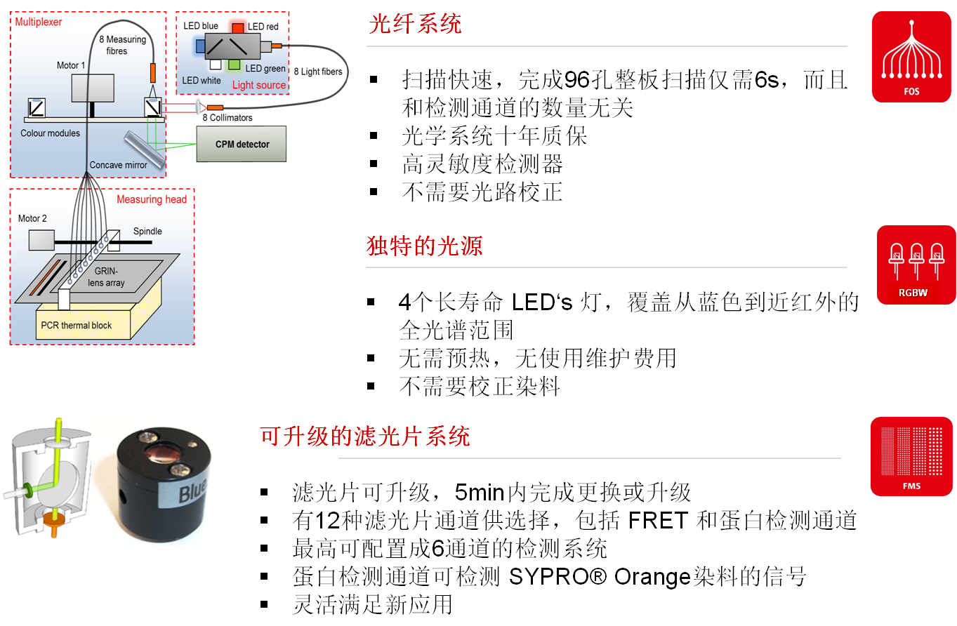 2、滤光片组:有12 种激发/检测滤光片组可供自由组合,包括滤光片错配的FRET检测组合和专用于蛋白熔解曲线分析的滤光片组